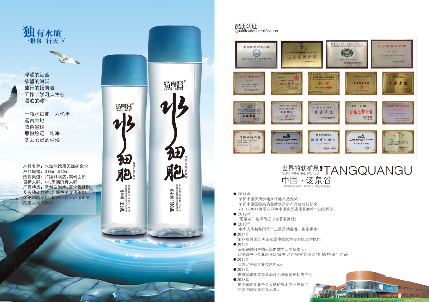 汤泉谷水细胞天然矿泉水是从地下120.1米深处经钻井采集,含有钙、镁、钾、锌、硒、锶、偏硅酸等多种人体所需的天然珍稀矿物质及微量元素,天然弱碱性水,能够快速穿透细胞,活化细胞酶组织,有助于软化心脑血管,改善人体微循环。